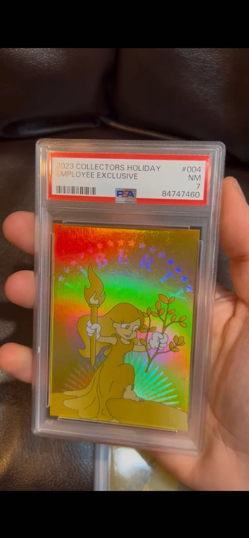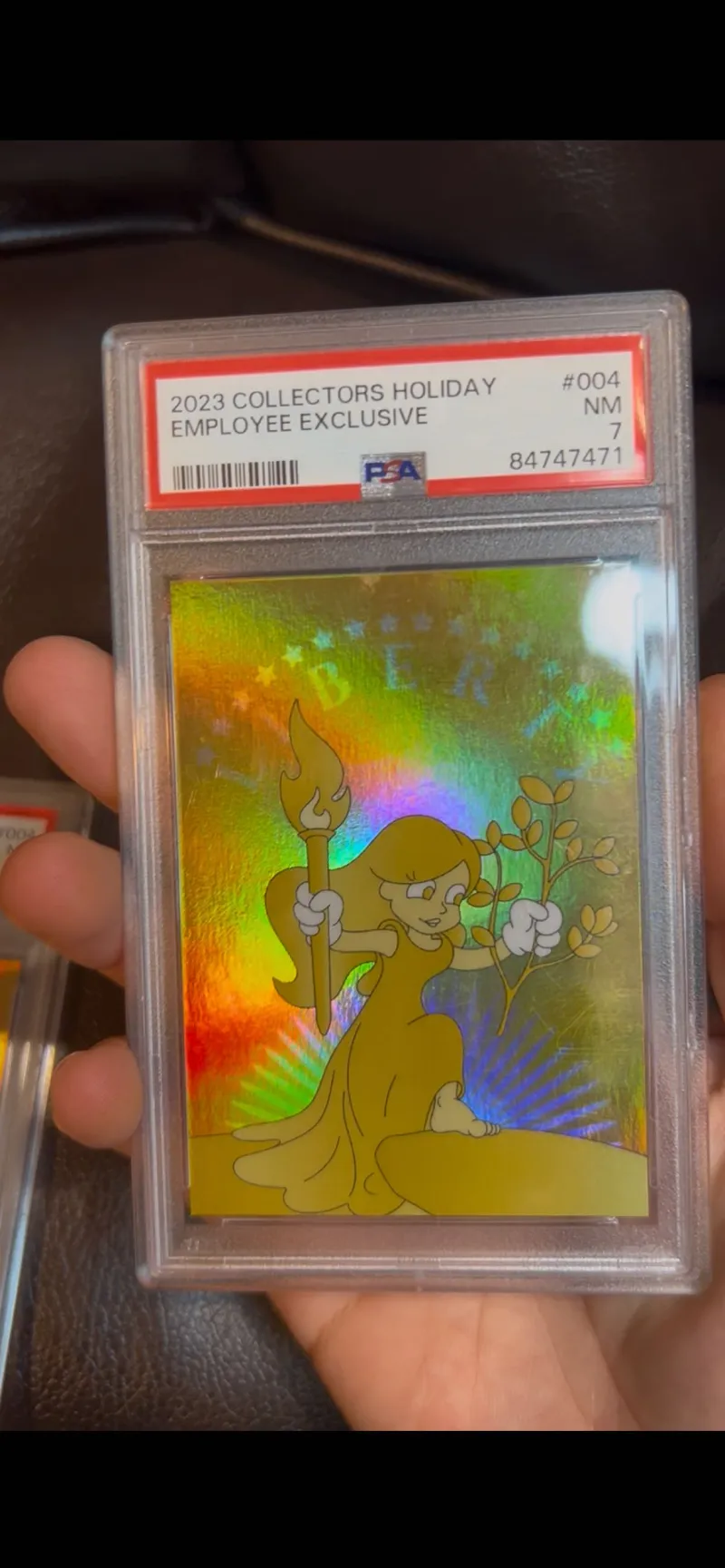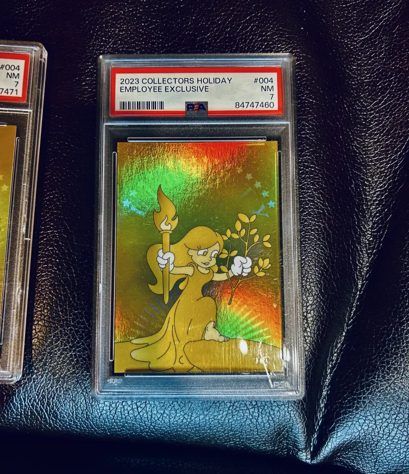 Rare PSA employee-exclusive holo card from the 2023 Collectors Holiday set. This card was ONLY given to PSA employees — never sold to the public. • PSA Graded: 7 (NM) • 2023 Employee Exclusive – Card #004 • Holographic Liberty Girl Design • Not available in retail packs • Short-run internal holiday release I personally received these while working at PSA in Jersey City. I have 2 copies available, both graded PSA 7. No idea why they graded at 7 — they were gifted already slabbed. These are