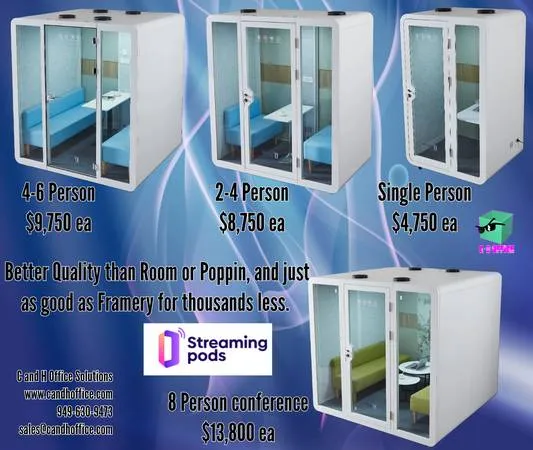 StreamingPods, presented By C and H Office Solution. Go to our webpage and read more below. You can visit our showrooms by appointment in San FransiscoHaywardor Orange CountyBuena Park Cut and copy this : https://www.candhoffice.com/stremaning-pods . . 1- Better Quality Then Room, Poppin, and just as good as Framery for thousands less. 2- Stainless Steel construction for better sound proofing and long lasting durability, full size work surface for Dual monitors and computer. 3-Dual Large 8 fans for better air circulation, thick tempered glass door and walls for open feeling and sound proofing. 12-16 more floor space to use a full sized chair. 4- Caster wheels for mobility in order to move around the office. Normally $6,000, we have them for $4,750.00 Delivery And Installation Available For A Fee. C and H Office Solutions 949-630-9473 ____________________________________________ Tall New Customer Price: $4,750 ea. per single person pod Quick ship in white or black is a 10-14 day lead time _________________________________________________ Grande 2-4 Person StreamingPods In white starting at $8,800.00 ea. 10-14 day quick ship comes in white paint only _________________________________________________ VENTI 4-6 Person StreamingPods in White Starting, $9,800.00 ea. 10-14 day Quick Ship Comes in White Paint Only _________________________________________________ Round Table Pod 8 person conference pod, $13,800.00 _________________________________________________ Cut and copy this : https://www.candhoffice.com/stremaning-pods 949-630-9473 salesatcandhoffice.com