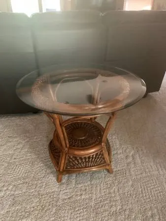Round Pier 1 Rattan & Wicker Beveled glass top side table, 26 in diameter and 22 tall, Excellent condition. 614-946-5482