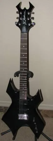 B.C.Rich Platinum Series Warlock Guitar -2-octave neck scale 24 frets - Dark Blue Wood Stained Solid Body - 6-string with Tremolo bar - Widow Headstock - Coffin Caseplastic handle broken Call 480-442-7835 if interested.