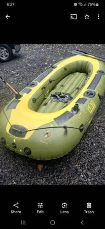 Lightly used 6 person 900 lb w 8 capacity heavy duty 32 Guage pvc material inflated le boat. This is a fish hunter hf 360 and has 4 air port inlets.great for lakes or small rivers.no accessories included just oars and battery bag holder. Built in oar holders and fishing rod holders.100.00 call 206-276-7028 thx.