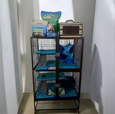 Double Prevue Ferret Cage in excellent condition Includes full matching blue bumble bee 🐝 decortop and bottom tray covers, both shelf covers, and h 1 ycomb hammock Also included are matching water and food dishes, litter box, brand new big bag of fresh news litter and brand new bag of freeze dried ferret food. Plus a carrier Pick up in Mcalester or can meet Please call or text 918-568-0608