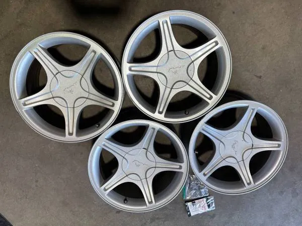 Call / Text 720-551-6907 This listing is for a set of 4 wheels / rims This set is priced at $350 OEM factory Original Brand: Ford Mustang Size: 17 x 8 Bolt Pattern: 5 x 4.5 / 5 x 114 Finish: Silver Comes with locking lug nut set and key Perfect winter set Installation is available. We also sell new and used tires.
