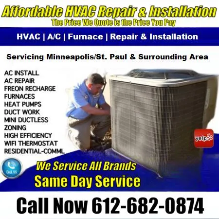 **Minneapolis/St. Paul 1 Affordable HVAC-Heating-Air Conditioning Repair & Installation Service** 24/7 Emergency HVAC Repair Service Highly Trained & Certified HVAC Technicians On Time and Dependable Service Call Appointments Detailed Written Estimates - No Hidden Fees Same Day Service The Most Affordable & Competitive Rates Servicing the Minneapolis/St. Paul & Surrounding Area For Fast Reliable Service 📞 Call Now:612-682-0874 The quality of our work is something we take very seriously. With over 20 Years Experience, Our technicians are HVAC certified and have the skills to meet all your heating and cooling needs. We install quality heating and air conditioning equipment that will guarantee a comfortable home, and peace of mind for many years to come. HVAC Services Residential A/C unit installs & Repair Resident Furnace installation & Repair Commercial A/C unit Installs & Repair Both Air Conditioning & Furnace Repair Capacitor replacement Blower motor and fan motor replacement Coil cleaning Air Conditioning Electrical issues Drain line flush Compressor issues Freon Leak repair Air handler issues Thermostat installation & upgrades Filter replacement Ductless Air Conditioning Service and Repair UV Air Cleaning Add FreonR 134 a R 22 R 410 a Maintenance Service Plans Available Much MoreCall Us for All Your HVAC Repair Needs Expert Air Conditioning Services: A/C Repair Air Conditi 1 r Installation Air Conditioning Replacement High Efficiency Air Conditi 1 r Upgrades Air Conditi 1 r Parts Air Conditi 1 r Maintenance Plans Air Conditi 1 r Repair Commercial HVAC Ductless Mini-Split Air Conditi 1 rs Single Room Air Conditi 1 rs Wall Mount Air Conditi 1 r Much More.. Expert Heating Services: Repair Service New Gas Furnace Sales Furnace Installation Furnace Replacement Heating Maintenance Contracts Commercial Heating and Cooling We Service All Major Air Conditioning Brands Including: Carrier, Trane, Lennox, Goodman, York, American Standard, Rheem, Ruud, Mitsubishi, Amana, Payne and many more For Fast Reliable Service 📞 Call Now 612-682-0874 Fast, affordable, local repairs, keeping your HEATING and COOLING systems operating at their best has never been easier. Our professional services include: Expert Indoor Air Quality Services: Air Conditioning Filters Furnace Filters Air Cleaners Air Purifiers Whole House Humidifiers Programmable Thermostats Heat Recovery Ventilators UltravioletUVGermicidal Lights For Fast Reliable Service 📞 Call Now 612-682-0874