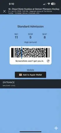 Interested? Send me a quick message here, and I’ll reply or 332-283-3577 My plans changed for Friday night, so I’m offering these seats so some 1 else can use them. St. Cloud State vs. Denver, January 23, 2026, 7:00 PM at Magness Arena, Ritchie Center. Section 11, Row 5, Seats 8 to 11. All 4 are together and close to the action. $50 each for all 4 seats. Just keeping it simple. If you’re reading this, the tickets are still available.