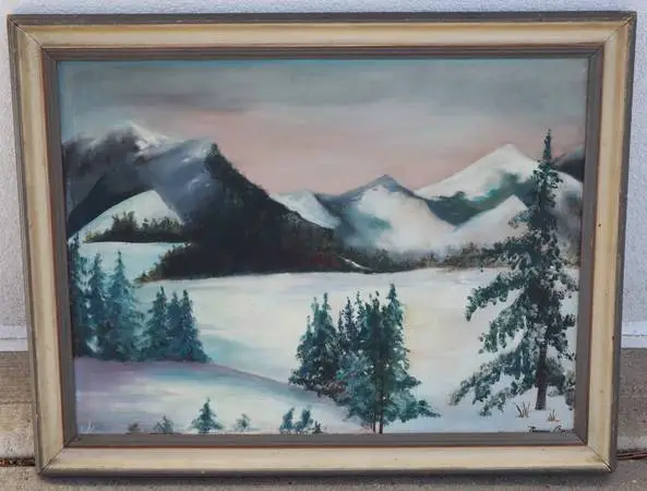 Antique Oil painting on board Winter Mountains signed Nancy Burg