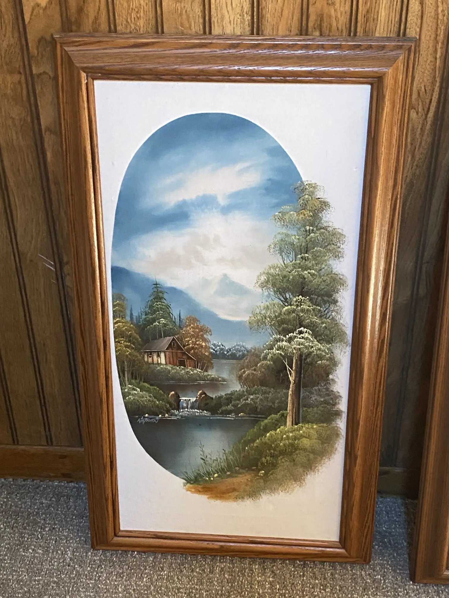 This is a vintage oil painting on canvas by the artist Nathan, depicting a scenic landscape with a cabin