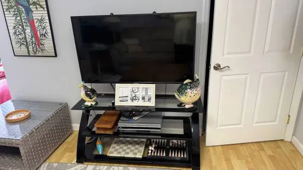 Z-Line 3 tiered TV stand. TV hangs on bracket and swivels. Shelves are 50 wide. $225 new on Wayfair. Text me at 908-403-7732