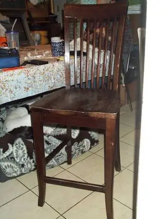 Ligo bar stool chair. For bar or tall kitchen table, work bench, kitchen, etc. Dark wood. There is a crack on the back rest. It could be wood glued. Other than that the chair is strong. Measures 173/4 wide x 20 deep x 45 h 8. 243/8 h 8 from floor to seating area. Pick up from Villa Park, Illinois. Please call or text 630-977-3882. If you email please include a phone number I can contact you at. Thanks for looking.
