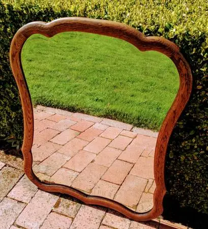 graceful design--hand bevelled glass--some degraded silver in bottom left corner, but good image reflection--frame is tiger oak with excellent new finish-- multiple inside and outside curves--TASTY! dimensions: width--22 h 8--261/4 price: $150, cash only, please contact Gary415-531-9555 please--no trolls If this ad is running, the mirror is for sale thanks for your interest