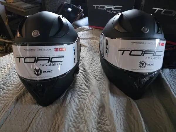 My husband bought these 2 helmets and has not even got them out of the boxes, the Bluetooth works on both and they have never been worn. We no longer have the bike so trying to get rid of some things. He paid $165 each now were just asking $120 each XS & L Text 940-393-5419