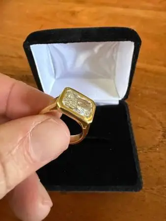 Description Custom piece. East West bezel set cushion cut stone. 18k gold. I had this made locally at a shop in the jewelry exchange building One of a kind. Diamond is lab made VVS grade G with an IGI certificate. Incredible ring, statement piece. Size 9 Ship / Delivery available
