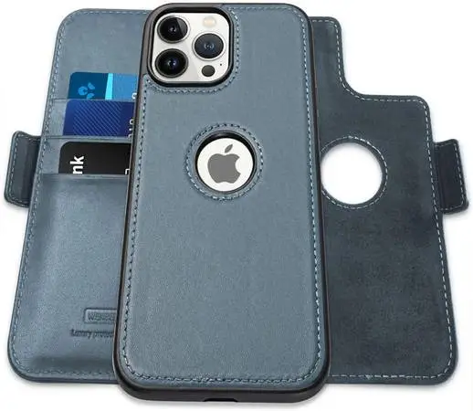 Genuine Leather Wallet case for iPhone 13 Pro Max, 2-in-1 Magnetic De