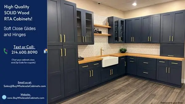 214-600-8090 We sell new Tier 1 All-Wood Kitchen and Bathroom Cabinetry. Soft-close European glides and hinges. Orders ship nationwide arriving within 5-8 days! IN STOCK NOW! SAVE UP TO 40 COMPARED TO RETAIL! BEST PRICE GUARANTEED! CONTRACTOR PRICING FOR EVERY 1 SHOP ONLINE / Download our Catalog at: www.BuyWholesaleCabinets.com ***Minimum order of 10 CABINETS*** Thousands of beautiful kitchens delivered with a 5 Star Rating. TEXT OR CALL US WITH YOUR CABINET SIZES AND WE WILL QUOTE YOU! WE PRIDE OURSELVES ON MOVING FASTER THAN ANY 1 IN THE INDUSTRY! Flat Pack Cabinets.Assembled optional Kitchen Cabinets, Vanity Cabinets, and Garage Cabinets *SEE PRICING BELOW* CALL OR TEXT 214-600-8090 PREMIUM QUALITY FEATURES: Solid Plywood Boxes Solid Wood Face Frame Cabinets UV Coated Natural Interior Cabinets Exterior Painted Dovetail Drawer Construction Full Overlay Front Drawers and Doors Shaker Door and Drawer Design Full Overlay from edge to edge cabinet door and drawers Premium DTC Full Extension Soft-Close Drawers Slides Soft-Close Doors Certainly! Here are the updated prices within the same body of text: Above stove /microwave cabinet: FS 30/12 - $126.50 FS 30/15 - $137.50 FS 30/18 - $148.50 FS 30/24 - $159.50 Above the Fridge Cabinet: FS 33/12 - $126.50 FS 33/15 - $137.50 FS 33/24 - $159.50 FS 36/12 - $137.50 FS 36/15 - $148.50 FS 36/18 - $159.50 FS 36/24 - $159.50 Wall Cabinets 30 inches tall: W 09/30 - $220.00 W 12/30 - $220.00 W 15/30 - $231.00 W 18/30 - $231.00 W 21/30 - $242.00 W 24/30 - $242.00 W 27/30 - $253.00 W 30/30 - $258.50 W 33/30 - $258.50 W 36/30 - $258.50 Wall Diagonal Corner 24/24/30- $269.50 Wall Cabinets 36 inches tall: W 09/36 - $236.50 W 12/36 - $236.50 W 15/36 - $247.50 W 18/36 - $258.50 W 21/36 - $258.50 W 24/36 - $258.50 W 27/36 - $264.00 W 30/36 - $275.00 W 33/36 - $275.00 W 36/36 - $280.50 Wall Diagonal Corner 24/24/36- $286.00 Wall Cabinets 42 inches tall: W 09/42 - $253.00 W 12/42 - $253.00 W 15/42 - $264.00 W 18/42 - $264.00 W 21/42 - $269.50 W 24/42 - $269.50 W 27/42 - $280.50 W 30/42 - $280.50 W 33/42 - $291.50 W 36/42 - $291.50 Wall Diagonal Corner 24/24/42- $313.50 Sink Base Cabinets: SB 30 - $242.00 SB 33 - $253.00 SB 36 - $269.50 Base Cabinets: B 09 - $231.00 B 12 - $231.00 B 15 - $242.00 B 18 - $242.00 B 21 - $253.00 B 24 - $258.50 B 27 - $275.00 B 30 - $275.00 B 33 - $286.00 B 36 - $297.00 Spice Base 09 $231.00 Garbage Base 18 $253.00 Drawer Base Cabinets: DB 12 - $280.50 DB 15 - $291.50 DB 18 - $303.60 DB 21 - $302.50 DB 24 - $313.50 DB 30 - $341.00 DB 36 - $368.50 CORNER BASE CABINET Blind base corner cabinets, LEFT OR RIGHT 42- $302.50 ea Lazy Susan Corner Base 33- $302.50 ea Lazy Susan Corner Base 36-$313.50 ea Pantry 18 X 84 $ - 583.00 24 X 84 $ - 638.00 30 X 84 $ - 693.00 18 X 90 $ - 605.00 24 X 90 $ - 660.00 30 X 90 $ - 715.00 18 X 96 $ - 660.00 24 X 96 $ - 682.00 30 X 96 $ - 715.00 Oven Pantry Cabinets OVD 30/84/24 - $ 649.00 OVD 30/90/24 - $ 660.00 OVD 30/96/24 - $ 704.00 OVD 33/84/24- $ 627.00 OVD 33/90/24- $ 660.00 OVD 33/96/24- $ 704.00 Matching available. The sizes range from 24 inches to 60 inch vanities. V 24 - $220.006 pieces available V 30 - $275.004 pieces available V 36 - $330.008 pieces available V 42 - $385.005 pieces available V 48 - $440.009 pieces available V 60 - $495.008 pieces available- Comes with single or double sink option ACCESORIES Scribe sticks 3/4 inches wide by 8 feet long $22 Outside Corner Molding 8 feet long $22 4 Crown Molding 8 feet long $93.50 23/4 Crown Molding 8 feet long $66 Dishwasher Panel $77 Toekick 8 feet long $27.50 each 4 x 8 island skin panel $170.50 Refrigerator Enclosure Panel $126.50 Filler 3 inches by 42 inches $27.50 Filler 6 inches by 42 inches $38.50 Filler 3 inches by 96 inches $49.50 Filler 6 inches by 96 inches $71.50 Keywords: Kitchen, Cabinets, Wood, Plywood, Sink, Door, Trim, Stainless, Steel, Pantry, Siding, Fence, Roof, Carpet, Tile, Granite, Countertop, Bar, Bathroom, Vanity, Remodel, Island, Office, Mudroom, Closet, Utility, Laundry, Cheap, Quality, Affordable, Renovation, Plumbing, Electrical, Drywall, Millwork, Glass, Heating, AC, Aircondition, Brick, Concrete, Backsplash, Floor, Flooring, Vinyl, LVP, Hardwood, Furnace, Range, Fridge, Refrigerator, Hood, Lights, Handles, Pulls, Cupboard, Wall, Ceiling, Texture, Quartz, Marble, Plastic, Corwn Molding, Espresso, Cherry, Maple, Birch, Walnut, Paint, Stain, Raised Panel, Design, Grey, Gray, White, Gray, Espresso, Dark, Brown, Black, Antique, Cherry, Coffee, Glaze, Solid, European, Raised panel, Modern, RTA, outlet, clearance, wholesale, wholesaler, supplier, importer, distributor, bath, traditional, classic, soft-close, accessories, in stock, prefabricated granite, quartz, prefab, peninsula, installation, assembly, semi custom, alton st 1 gray, charleston saddle, pure white, ork chocolate, home, decor, solid, store, contractor, liquidator, tiles, mosaic, backsplash, glass, st 1, countertop, mable, pulls, knobs, door handles, farmhouse sink, apron, undermount, top mount, laminate flooring, hardwood, engineered, SPC, budget, low price, affordable, inexpensive, cabinetry, bargain, builder, cheap, high quality, good deal, contemporary, rustic, formica, eco friendly, finest 1, silest 1, cambrai, penal, slabs, warehouse, onyx, oak, birch, 10 x 10, home improvement, DIY, sale White, Gray, Espresso, Dark, Brown, Black, Antique, Cherry, Coffee, Glaze, Solid, European, Raised panel, Modern, RTA, outlet, clearance, wholesale, wholesaler, supplier, importer, distributor, bath, traditional, classic, soft-close, accessories, in stock, prefabricated granite, quartz, prefab, peninsula, installation, assembly, semi custom, alton st 1 gray, charleston saddle, pure white, ork chocolate, home, decor, solid, store, contractor, liquidator, tiles, mosaic, backsplash, glass, st 1, countertop, mable, pulls, knobs, door handles, farmhouse sink, apron, undermount, top mount, laminate flooring, hardwood, engineered, SPC, budget, low price, affordable, inexpensive, c