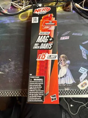 I am selling a Nerf Pro Half-Length Dart Magazine. This includes 1 Nerf Pro half-length dart magazine with 15-dart capacity and 15 Nerf Pro half-length darts. This Nerf Pro Magazine is brand-new and still in the sealed box. I am asking $6.00. I will not accept trades or will not deliver. If you have any questions, ONLY TEXT ME at 505-575-3335.