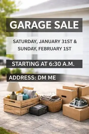 Hi 👋 I’m having a garage sale in west Palmdale at 630am this Saturday 1/31 and Sunday 2/1. The home is close to the mall. DM for address. dates:saturday 2026-01-31 sunday 2026-02-01 start time: 6:30am