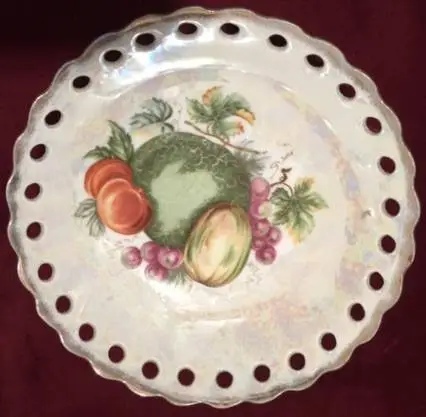 Hand Painted Pedestal Dish ~ Reticulated Lusterware - Excellent condition ~ Lefton China 8 diameter Most likely from the 50s (has been in my family since) ~ 5 inches high, 8 inches across. A crackled, iridescent rainbow finish (this is called Lusterware). Open weave cutwork (reticulated, lattice) on the edge. Vintage hand painted (made in Japan). This is the famous and highly collectible Lefton China. George Lefton was called the China King. This is a beautiful delicate and very regal piece. Gold accents and it shimmers with an opalescence (called lusterware). It is in perfect condition, beautiful scallops on top, gold band on the perimeter of the top and the bottom. Fenton did not start using molded marks in their glass until the 1970’s. The majority of Fenton was only marked with a sticker. Most of the stickers have been lost or removed over time.