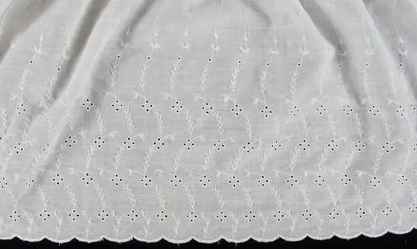 Queen size. 14 drop. Top is a white gauzy breathable cotton 58 x 80. The drop is off white color, scalloped, small flowers and tendrils. Hand washed and sun dried. Has been in storage forever and is therefore in great condition. From a smoke-free/pet-free home. Very cute design. Generously gathered. Goes all around the bed except for the head of the bed. Top is pure white and 100 percent cotton. The gathered ruffle part is off white and I think may be a cotton blend. It has been in the family for decades and stored in the linen closet at my Mothers home. Crafted with Pride in the U.S.A. tag on it.