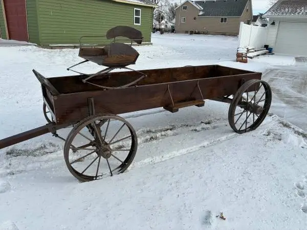 Decorative wagon made from oak wood. Sides and floor are a least 11/2 thick oak wood, seat and tongue also oak. Wagon box is 10 ft long and 38 wide. Wagon rolls and turns like it should. Gear is a 802 model primed and then painted with Rustoleum paint. Cash sales only and delivery available at $2.00 a loaded mile from Dysart Iowa. Callno texts 319-240-5430. Wagons by Rod.