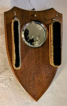 Valet mirror, oak shield frame, 2 brushes