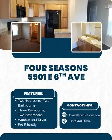 Four Seasons - A place to call home! Bed: 2 / Bath: 2 Sq. Footage: 1025 sq ft Rent: $1899/Month Terms: 10-Month, 11-Month, 12-Month Call us at Leasing office located on Driftwood New 2 and 3 bedroom manufactured homes with 2 full bathrooms ready and waiting for you. Homes are approximately 1025 square feet of living space. Each home comes with granite counter tops in kitchen and baths. Enjoy taking advantage of your own full size washer and dryer! Four Seasons is a pet friendly community and we look forward to meeting your furry family members. The community is conveniently located close to Glenn Highway, military bases, shopping and entertainment. Our Apartment Homes Feature: ● Cable Ready ● Dishwasher ● Hardwood Floors ● Heating ● Microwave ● Oven ● Refrigerator ● Tub/Shower ● Washer/Dryer ● Built-in microwave ● Double Sinks ● Gas Stoves ● Marble counter tops Our Residents Enjoy: ● Accepts Electronic Payments ● Close to Shopping and Entertainment ● Clubhouse ● Courtesy Patrol ● Dining Nearby ● Maintenance on site ● Onsite Management ● Pet Friendly ● 1 mile to Joint Base Elmendorf Richardson ● 24-Hour Emergency Maintenance ● Close to Glenn Highway ● Local Schools: Bartlett High School, Clark Middle School and Ptarmigan Elementary School ● Online Rent Payment ● Online Service Requests ● Washer & Dryer In Unit Call us at 5901 E 6th Ave. Office Anchorage, AK 99504 Website: www.leaseaptsnow.com?n=four_seasons&rp=bu0tdpsc1f&t=wb Online Application: www.leaseaptsnow.com?n=four_seasons&rp=bu0tdpsc1f&t=ap 3D Virtual Tour: www.leaseaptsnow.com?n=four_seasons&rp=bu0tdpsc1f&t=trt Mon - FRI: 10:00 AM - 6:00 PM Pets: Breed Restriction No Weight Restrictions Limit to 2 pets. No weight limit. Certain breed restrictions apply. Along with our income and credit requirements, we do not automatically exclude rental applicants based on criminal history. Any criminal history will be evaluated in consideration of when the crime occurred, what the underlying conduct entailed and/or what the rental applicant has done since the conviction. Prices and availability subject to change EQUAL HOUSING OPPORTUNITY 02DA8783904A4E0