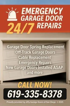 Looking for dependable and affordable garage door services in San Diego? Call Jiffy Garage Doors NOW! We specialize in: Garage door installation Garage door repair Routine maintenance Emergency services Our experienced technicians are committed to providing top-notch service to ensure your garage door operates smoothly and safely. Why Choose Jiffy Garage Doors? Prompt and reliable service Affordable pricing Customer satisfaction guaranteed Dont let a faulty garage door disrupt your day. Contact us now at 619-335-8378 Trust Jiffy Garage Doors for all your garage door needs in San Diego! --- 👷️🔧Your Garage Door Repair Specialists - Jiffy Garage Doors of San Diego 🏡 Jiffy Garage Doors of San Diego is your go-to expert for all your garage door repair needs! With a passion for exceptional service and unmatched expertise, our team of skilled technicians is dedicated to keeping your garage doors functioning at their best. At Jiffy Garage Doors, we understand the importance of a well-maintained garage door system. Thats why we specialize in providing top-notch repair services that will keep your home or business running smoothly. Our comprehensive repair solutions include: 1. 💪 Spring Replacement: Broken or worn-out springs can cause serious issues with your garage doors operation. Trust our experts to replace them quickly and safely. 2. 🔩 Track and Roller Repair: Misaligned tracks or damaged rollers can lead to uneven door movement or even cause your door to come off its tracks. Well ensure your door glides smoothly and efficiently. 3. 🛠️ Panel Replacement: Damaged panels can detract from your propertys curb appeal and compromise your garage doors integrity. Well replace them with precision and care. 4. 🛡️ Garage Door Tune-Up: Regular maintenance is key to prolonging the life of your garage door system. Our tune-up service includes a thorough inspection, lubrication, and adjustment of all critical comp 1 nts. As a locally-owned and operated business, Jiffy Garage Doors of San Diego is committed to delivering reliable, trus 2 rthy service to our valued customers. When you choose us for your garage door repair needs, youre choosing a company that stands behind its work and prioritizes your satisfaction. Dont let a malfunctioning garage door disrupt your daily routine. CALL NOW 619-335-8378 and when you mention this Craigslist ad, youll unlock exclusive discounts and promotions! Thank you for choosing Jiffy Garage Doors of San Diego for all your garage door repair needs. We look forward to serving you! phone:619-335-8378 Garage door repair, garage door replacement, garage door off track, garage door service, tuneup, remotes, clairemont, la mesa, spring valley, poway, chula vista, la jolla, mira mesa, bonita, miramar, san ysidro, garage door maintenance, rollers, hardware, wiring, rewire, door hangers, overhead garage doors service, tilt up doors, rollup doors, sectional garage doors, metal residential, hinges, tracks, springs, repiars repacement, tunup, servce, serivce, cabels, ball bearing wheels, chain, belt, new garage door installation, emergency garage door repair, garage door wont open, broke, bonita, carriage style doors, glass garage doors, spings, san marcos, carlsbad, encinitas, oceanside, escondido, del mar, ocean beach, pacific beach, San Diego, CA new garage doors