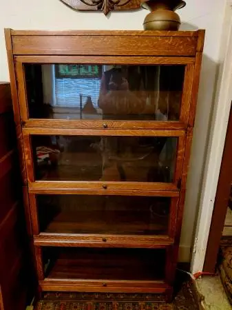 outstanding tiger oak Arts & Crafts barrister bookcase--excellent original condition--original wavy glass--original brass knobs--original finish--circa 1910 s-- 4 sections with smoothly functioning glass doors--bottom support section with rectangular legs--top sectionor capwith appropriate original rectangular design--very nice dimensions: h 8--62 width--35 price: $950, cash only, please call Gary415-531-9555 if listing is running, item is ...