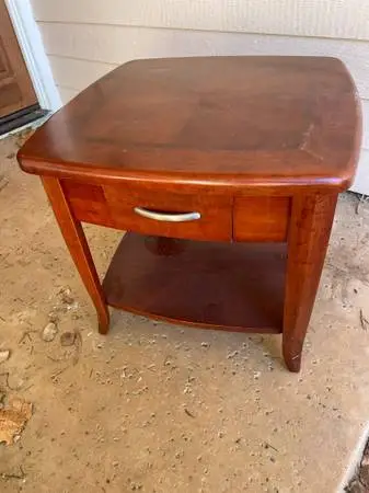 End table/night stand cherry brown, 2 tier for magazines etc and comes with a drawer, heavy, solid wood, no particle board, well made, the top has some scratches Dimensions are 25.5 inch by 25.5 inch by 23 inch h 8 $20 in SOUTH ESCONDIDO 92029 Text or call No emails. 760-685-8291