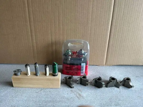 Half inch shank router cutters Never been used 7 are carbide tipped Rest are high speed cutters they make a mandrel For use in routers Please phone call only 937-272-3401