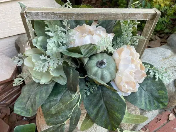 centerpiece decor, wood box with handle filled with artificial flowers and pumpkins, $15 in south Escondido 92029 Text or call 760-685-8291