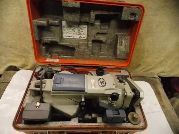 SOKKIA Total Station SET 5 F / 5 FS Dual Display Surveying Tested w/ Case Charger 2 Batteries Good Working Used Survey Tool to use with Tripod Legs. Call 952-854-5786 Key Words: Sokkia Set 5 f Surveying Total Station Theodolite setup , Topcon, Trimble, Leica, Nikon, Transit, Lietz Sokkia “All Weather” easy to use total station is setting a new standard for surveying. Whether it be the tightest control survey, construction staking or boundary survey. With 5 second angular accuracy and its rugged design the SET 5 F is suitable for use in the toughest environments. Sokkia’s application programs makes surveying work quick and simple in the field. Sokkia SET 5 F can stand up to any wet weather condition that can occur in the field, giving the benefit of not experiencing down time due to inclement weather. Displays on each side of the instrument means you can shoot reverse angles easily. With on-board data collection capability, simple operations can be achieved by selecting the necessary functions, such as data collection, layout and memory manager routines from the main menu. For enhanced operation in the field, the internal memory stores up to 3,000 points. Data transfer to a personal computer or a data collector is possible with the RS-232 C interface cable. Sokkia’s dual electronic tilt compensator automatically detects inclination of the standing axis and applies a correction to vertical angles. This provides accurate elevation measurements, even if the instrument is not precisely leveled. Magnification: 26 X Image: Erect Minimum focusing distance: 1.3 m/4.3 Angle accuracy: 5/1.8 mgon Angle minimum display reading: 1/5 Angle reading system: Dual-side reading Angle units: Switchable between meter or feet, angle degrees or gon Distance measurement: 1 Prism: 9,800, 3 Prism: 13,000 Distance measurement to target sheet RS 90 N-K: 1,640 Distance measurement to target sheet RS 50 N-K: 980 Distance measurement to target sheet RS 10 N-K: 320 Distance measurement to prismless mode: 320 Distance measurement precision: 2 mm 2 pmmPrism mode/3 mm 2 ppmNon/prism mode Distance measuring time: 1.6 s+every 0.3 s tracking mode Distance measuring time: 1.6 s+every 0.3 s coarse mode Distance measuring time: 2.6 s+every 1.3 s fine mode Distance minimum display: 1 mm/0.003 ft Display: Single Data input/output: RS-232 C compatible, asynchronous serial Internal memory: Surveying data + coordinates data total 10,000 points Compensator: Liquid dual axis Compensating range/Accuracy: 3/0.3 Optical plummet: Erect 3 X W 8: 5.3 kg, 12 lbs including tribrach and battery