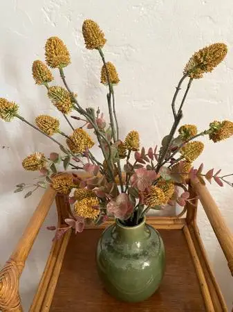 Charming faux wildflower arrangement. Set in a glossy jade green ceramic vase 6 tall x 45/8 W, this arrangement stands 16.5 tall and 11.5 wide. making it the perfect accent for desks, shelves, entry tables, or gifting Great condition, from smoke free household CASH ONLY Text if you are interested: 646-673-1516 I can meet you near Walgreens, located at 3501 Lomas Blvd NE. I will no respond to codes or unusual payment methods. Please dont text me with a request to email you back. Thank you