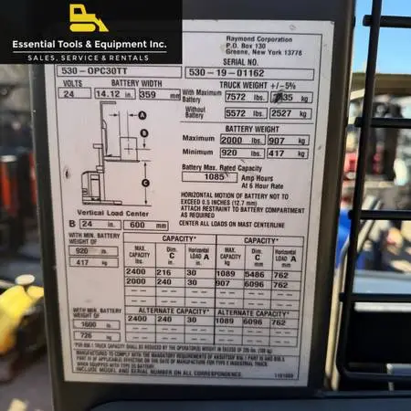 2019 Raymond 530-OPC 30 TT 240 Max H 8/3,000 lbs. Electric Stand Up Forklift Forklift is running as it should. Battery holds a good charge. Charger not included. Year: 2019 Brand: Raymond Model: 530-OPC 30 TT Hours: 21,204 KH Fuel: Electric Tire: Polyurethanenon-marking Fork Length: 60 Maximum Lift H 8: 240 Steering: Electric Power Steering Controls: Dual control handle for lift and drive functions Operator Position: Stand-up with ergonomic platform and anti-slip surface Feel free to come on down to check out our inventory! Contact us for a shipping quote. We work with a number of carriers so we can offer reasonable prices Most items are delivered within 10-14 business days from date of purchase. Price: $7,650 plus tax Cash or Wire Call or Text 832-544-9361 essentialtoolsequipment.com We are a heavy equipment dealer located in Channelview, Texas. Feel free to stop by and check out our line up of machines! Essential Tools And Equipment Inc. 15812 Lorenzo St. Channelview TX, 77530 7:00 AM-4:00 PM ATLAS COPCO, BOBCAT, BOMAG, CASE, CAT, CATERPILLAR, DEERE, DYNAPAC, GEHL, GENIE, HAMM, HITACHI, HYSTER, IHI, INGERSOLL RAND, JCB, JLG, JOHN DEERE, KOBELCO, KOMATSU, KUBOTA, LAYMOR, LEE BOY, LINKBELT, MUSTANG, MOROOKA, NEW HOLLAND, SKYJACK, TAKEUCHI, TEREX, VOLVO, WACKER NEUSON, YANMAR, AIR COMPRESSOR, BACKHOE, BULLDOZER, COMPACTOR, DOZER, CRANE, EXCAVATOR, FORKLIFT, GENERATOR, GRADER, MOTOR GRADER, BOOM LIFT, SCISSOR LIFT, MINI EXCAVATOR, REACH LIFT, ROLLER, SCRAPER, SKID STEER, TELEHANDLER, TRACK LOADER, TRACTOR, TRAILER, TRUCK, DUMP TRUCK, PICKUP TRUCK, WATER TRUCK, WHEEL LOADER