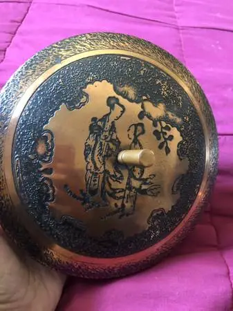 Call or text when ready to purchase 210-300-1759 Kupfer Dose in Antike Original-Kupferobjekte Sugar Bowl Circa 1920 Gold and Black Measures 10 diameter $50 Local Pick Up or Shipping Available$75 shipping Call or text when ready to purchase 210-300-1759 Please text or call only when on the way to purchase.