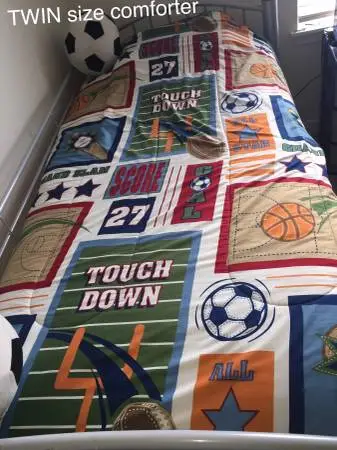 Pet-free, smoke-free home, like new! Only used for staging purposes Selling TWIN size 4-piece bedding as a lot! Included: 1. NEW fitted sheetblue, still in original packaging 2. NEW flat sheetblue, still in original packaging 3. NEW pillow casestill in original packaging 4. Twin size comfortermultiple sportssize is 66 x 88 inches Valued at $119.99 Selling TWIN size bedding lot for only $40 cash only please! *Plush soccer balls are NOT included* Also for sale: 3-piece sports canvasmiddle size 21 x 21 and side canvas 10 x 10 and a metal basket! If you are interested, call or text 303-918-9347. If you see this ad, they are still available! Im located near 96 th and Tower in Commerce City or at Alameda and Federal in Denver certain days of the week. Occasionally I drive to surrounding areas such as Littleton, Englewood, Lakewood, Aurora, Arvada, Thornton, Westminster, Broomfield, Centennial, Highlands Ranch, Castle Rock, etc. Thank you for looking! Hablo español!