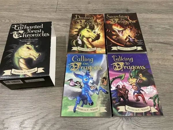 THE ENCHANTED FOREST CHRONICLES by Patricia C. Wrede 1-4 Paperback Books Boxed Set ~ Magical Bedtime Stories for Kids Paperback by Patricia C. Wrede 4 Paperback Books Reading age 8-12 years Pick up 192 nd & Harrison area Text 402-889-5046